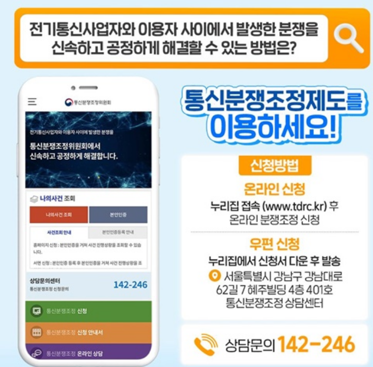 (주소: 서울특별시 강남구 강남대로 62길 7 혜주빌딩 4층 401호 통신분쟁조정 상담센터)