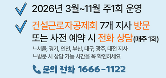 고용노동부와 건설근로자공제회(2026.03.23)에서 '공인노무사 무료상담 서비스'를 시작했습니다.
