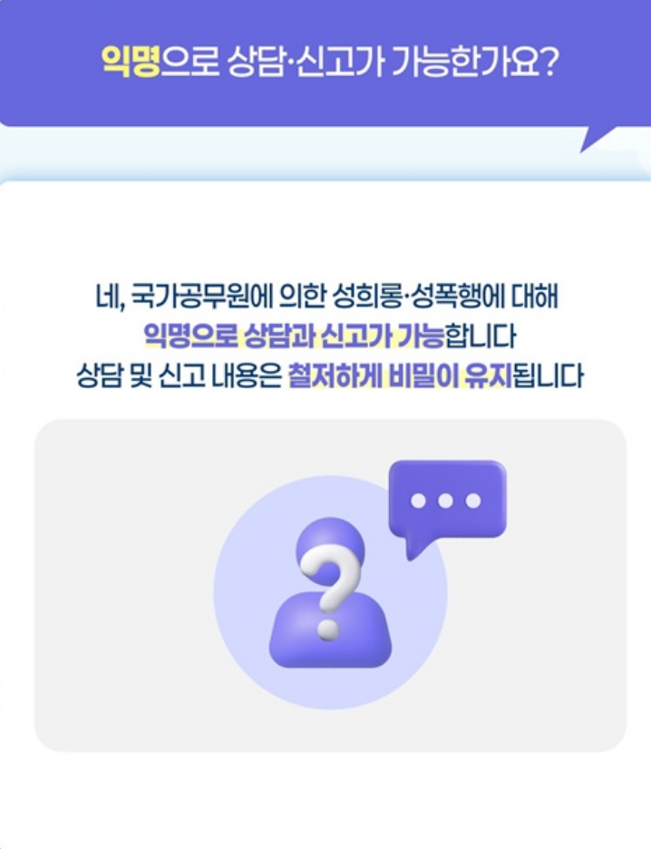 익명 상담 및 신고 가능: 상담 단계에서는 본인을 밝히지 않고도 충분히 도움을 받을 수 있습니다.