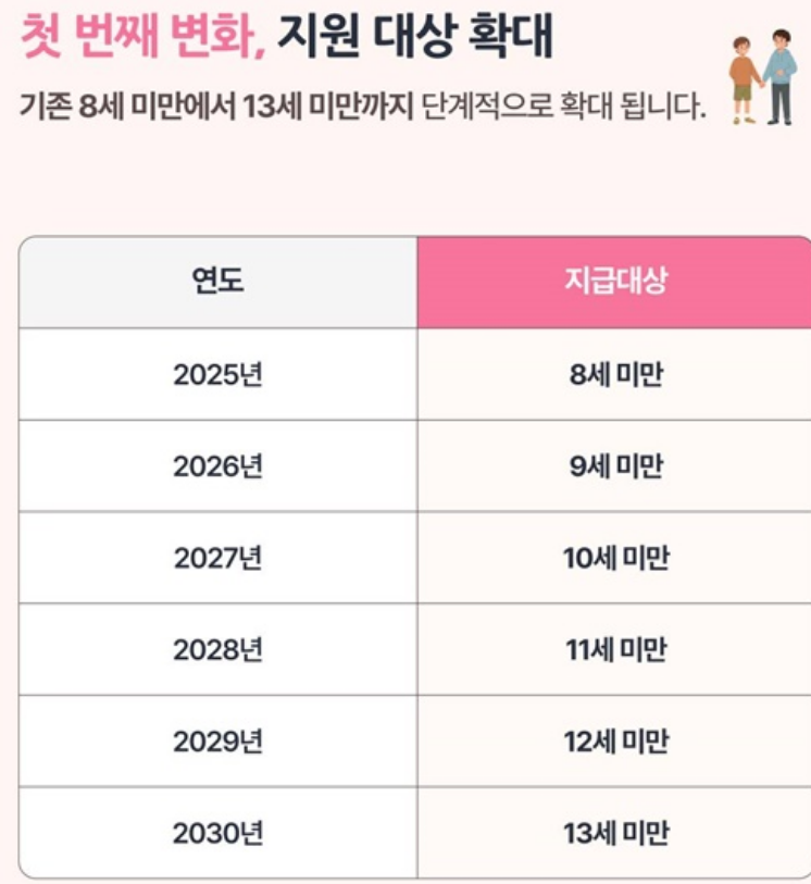 기존 8세 미만까지만 주던 아동수당이 이제 초등학생 고학년(13세 미만)까지 단계적으로 늘어납니다.