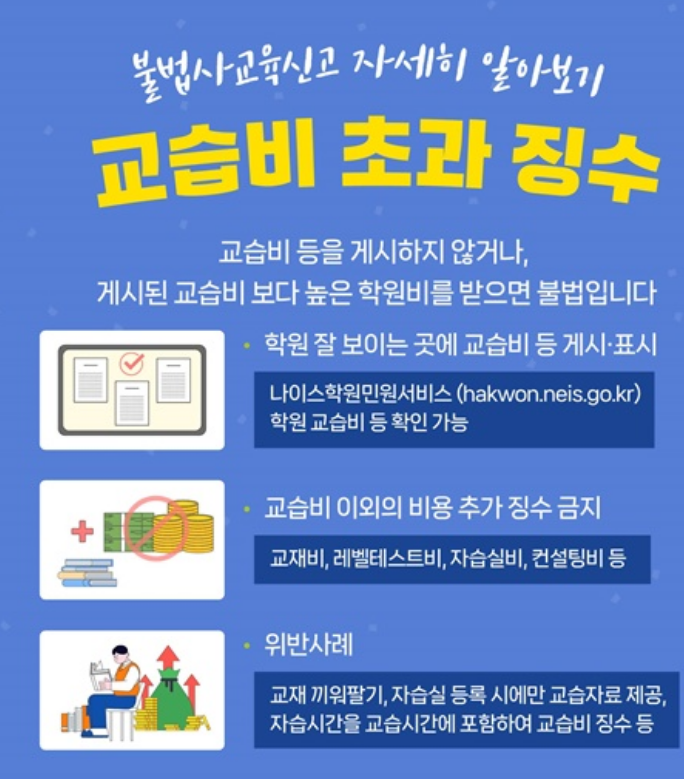 추가 비용 징수 금지: 교재비, 레벨 테스트비, 자습실 이용료 등을 별도로 강요하며 교습비 외의 비용을 받는 행위는 위반 사항입니다.