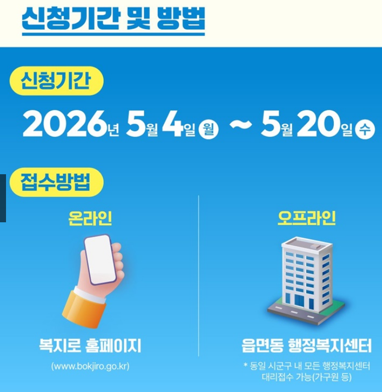 2. 오프라인: 거주지 읍면동 행정복지센터 방문 접수 (대리 접수도 가능합니다.)