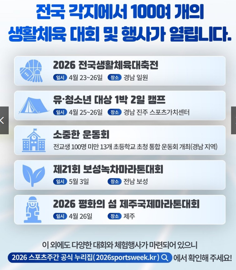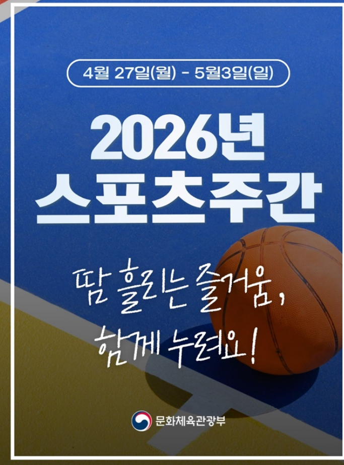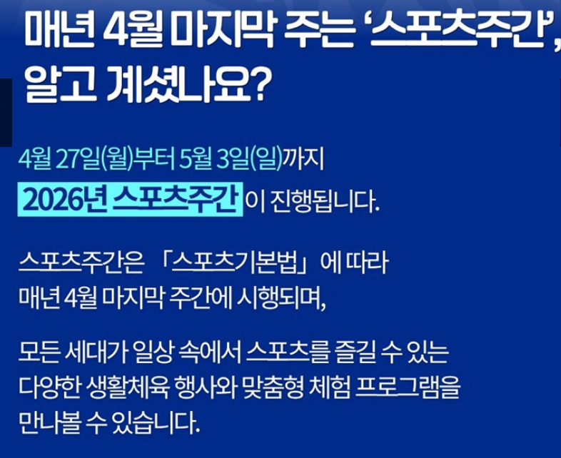 올해 2026년 스포츠주간은 4월 27일(월)부터 5월 3일(일)까지 일주일간 진행되는데요.