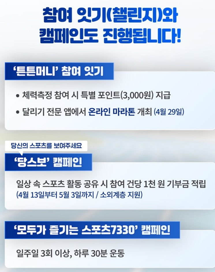 스포츠주간 기간 동안 지정된 인증 시설에서 체력을 측정하거나 운동에 참여하면 특별 포인트 3,000원이 지급됩니다.