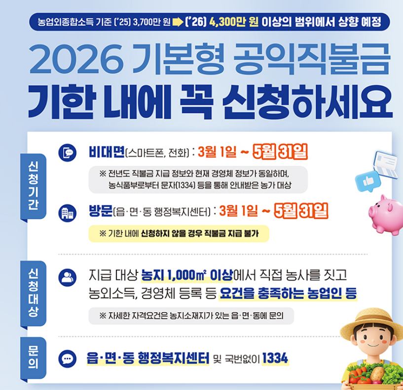 '2026년 기본형 공익직불금' 신청 시기가 돌아왔습니다. 올해는 특히 지원 대상이 확대되는 중요한 변화가 있어 더욱 꼼꼼히 챙기셔야 하는데요.