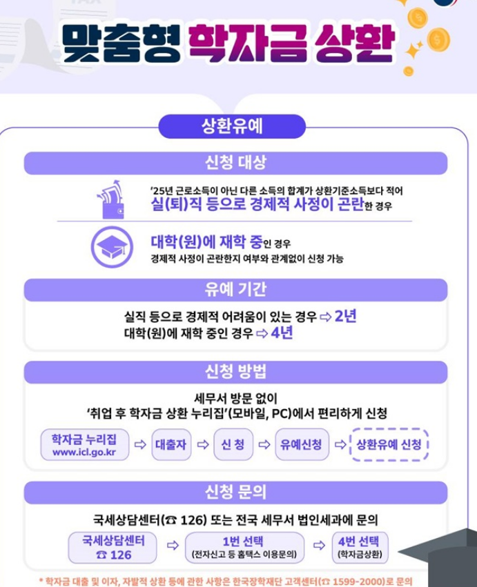대학(원)에 재학 중인 경우: 경제적 사정과 관계없이 신청 가능하며, 최대 4년간 유예됩니다.