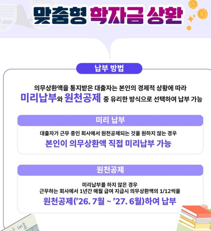 방법: 의무상환액의 1/12씩 매월 월급에서 차감됩니다. 별도 신청이 없으면 자동으로 이 방식이 적용됩니다.