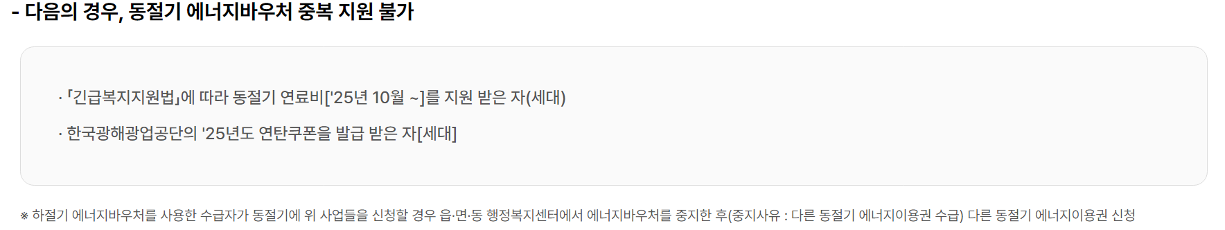 주소 변경이나 세대 구성원 변동 등 개인정보 변경이 있는 경우에는 반드시 재신청해야 정상적으로 지원받을 수 있습니다.