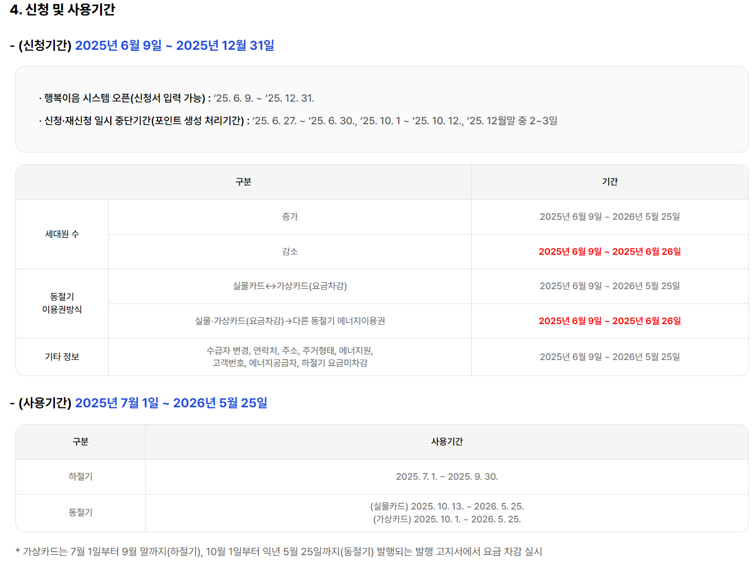 사용 기간은 하절기는 7월 1일부터 9월 30일까지이며, 동절기는 가상카드는 10월 1일부터, 실물카드는 10월 13일부터 2026년 5월 25일까지 사용할 수 있습니다. 사용처는 전기, 도시가스, 지역난방, 등유, 연탄, LPG 등이며, 바우처 신청 시 어떤 방식으로 사용할지 미리 선택해야 합니다.