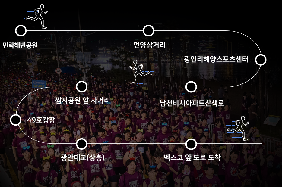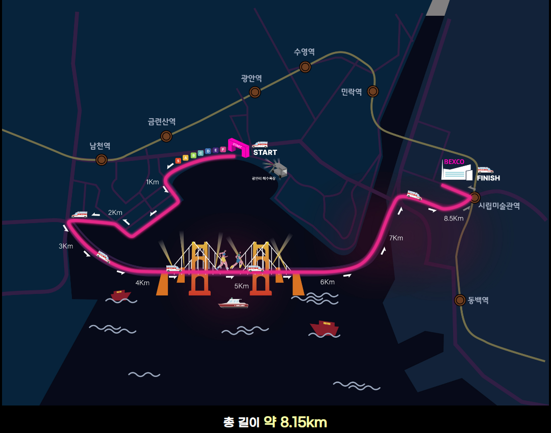 주행 코스는 광안리 해변→남천 해변공원→광안대교→벡스코를 연결하는 총 8.15km 길이로 구성되어 있으며, 광안대교를 밝히는 불빛 아래에서 달릴 수 있는 유일무이한 기회입니다
