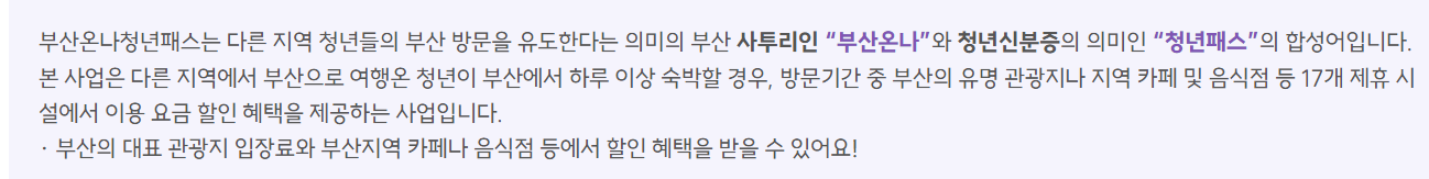 ‘부산온나청년패스’는 ‘부산으로 와라’라는 뜻의 경상도 사투리 ‘온나’와 청년의 여행패스를 결합해 만든 이름입니다. 이 사업은 부산 외 지역에 거주하는 만 18세~39세 청년이 부산에서 하루 이상 숙박할 경우, 지역 내 17개 제휴 업체에서 할인 혜택을 받을 수 있도록 한 프로그램입니다.