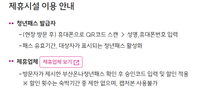 부산의 대표 관광지, 음식점, 카페 등 총 17개 제휴 업체에서 청년패스 소지자에게 할인 혜택을 제공합니다.