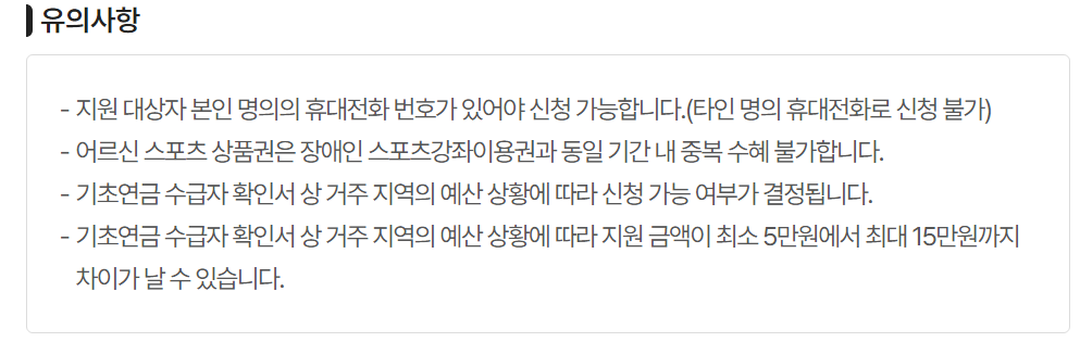 1960년 이전 출생자이면서, 신청일 기준으로 기초연금을 수급 중인 분만 해당합니다. 또한 2025년도에 ‘장애인 스포츠강좌 이용권’을 받고 있다면 중복 수혜가 불가능하므로 신청이 제한됩니다.