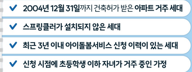 이번 무상 지원은 특정 요건을 충족하는 돌봄 공백 세대의 아파트 거주자를 대상으로 합니다. 구체적인 요건은 다음과 같습니다.