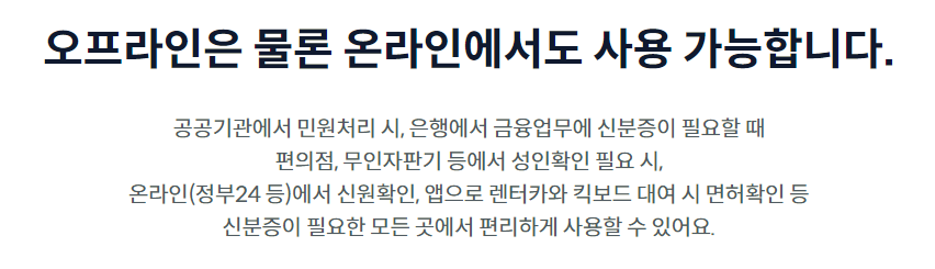 특히 금융기관과 공공기관에서는 실물 신분증과 동일한 수준의 효력을 인정하고 있기 때문에 매우 유용하다. 다만, 아직 모든 민간업체에서 지원하는 것은 아니므로 사용 가능 여부는 사전에 확인하는 것이 좋다.