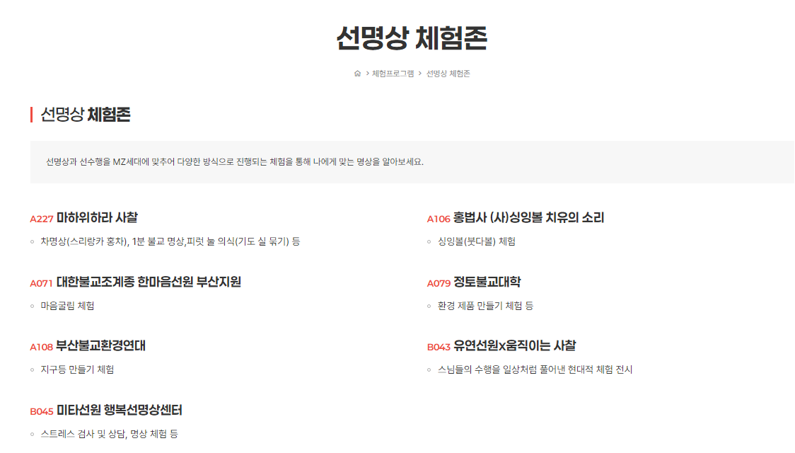 선명상 체험존: 좌선, 워킹 명상 등 다양한 명상 체험을 할 수 있는 공간이 운영되었습니다