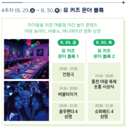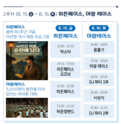 이후 매주 금·토요일에는 색다른 테마 프로그램이 펼쳐집니다. 9일에는 시원한 물총 놀이와 DJ 공연을 결합한 ‘워터파티’가 열려 더위를 날리고, 15일에는 광복 80주년을 기념하는 야외 방탈출 게임 ‘히든페이스’가 진행됩니다. 16일에는 동천 야경을 따라 달리는 ‘야광 레이스’가 열려 참여자들이 빛나는 장비를 착용하고 함께 달리며 특별한 체험을 합니다.