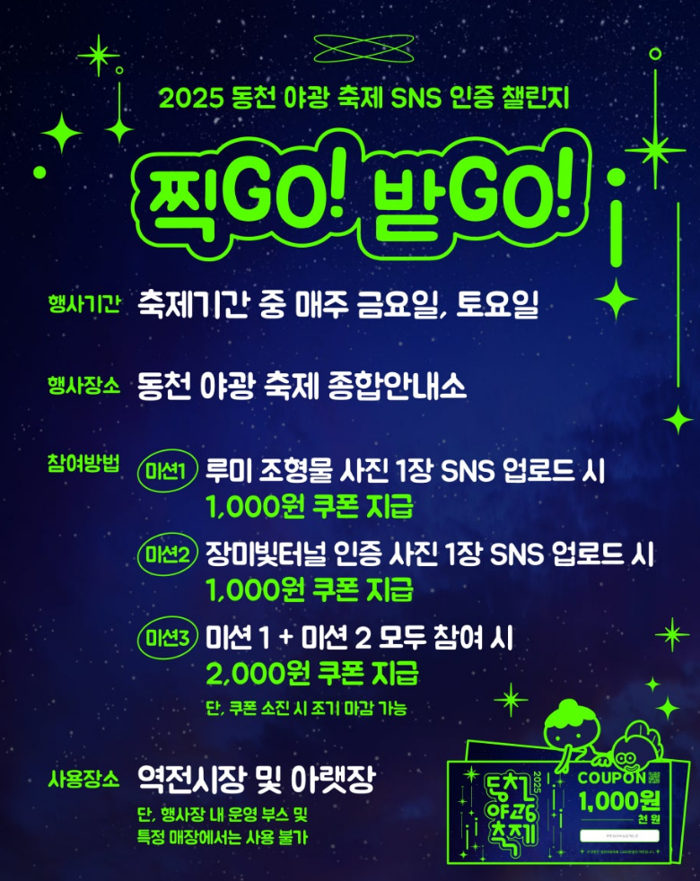 동천야광축제는 단순히 즐기고 보는 행사에 그치지 않고, 지역경제 활성화에도 기여합니다. 축제장 인근의 아랫장과 역전시장에서 사용할 수 있는 SNS 인증 할인쿠폰이 제공되며, 현장에는 ‘배달존’을 운영해 방문객이 전통시장의 다양한 음식을 편리하게 즐길 수 있도록 했습니다.