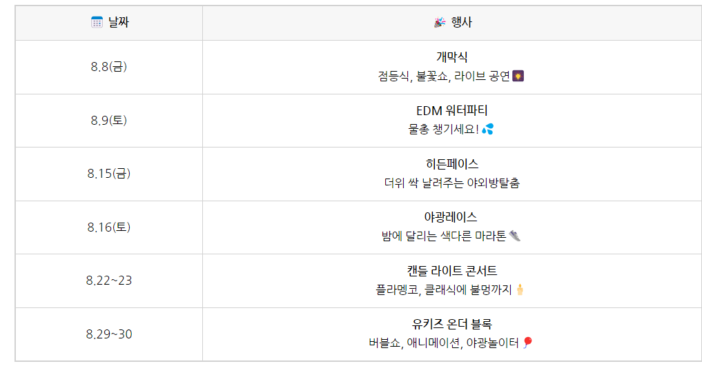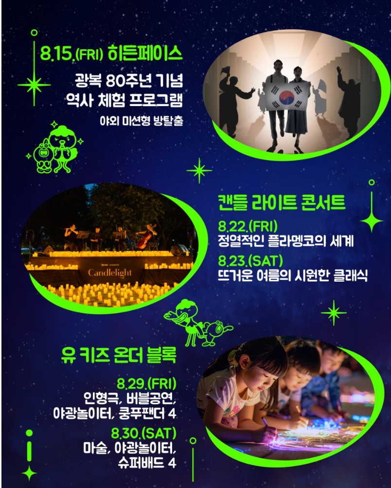 마지막 주말인 22일과 23일에는 수천 개의 촛불이 무대를 밝히는 ‘캔들라이트 콘서트’가 열립니다. 이 공연은 아날로그적인 감성과 고즈넉한 분위기를 선사하며, 한여름 밤의 정취를 최고조로 끌어올립니다.