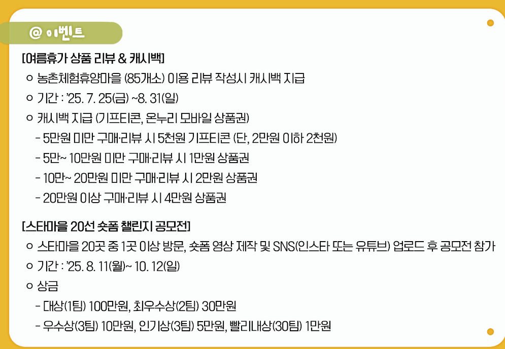 85개 농촌체험휴양마을 관광상품 이용 후 리뷰를 등록한 관광객에게 결제 금액의 10~20%(최대 4만 원)를 상품권 등으로 환급하는 ‘여름상품 리뷰 & 캐시백 이벤트’를 진행합니다.
