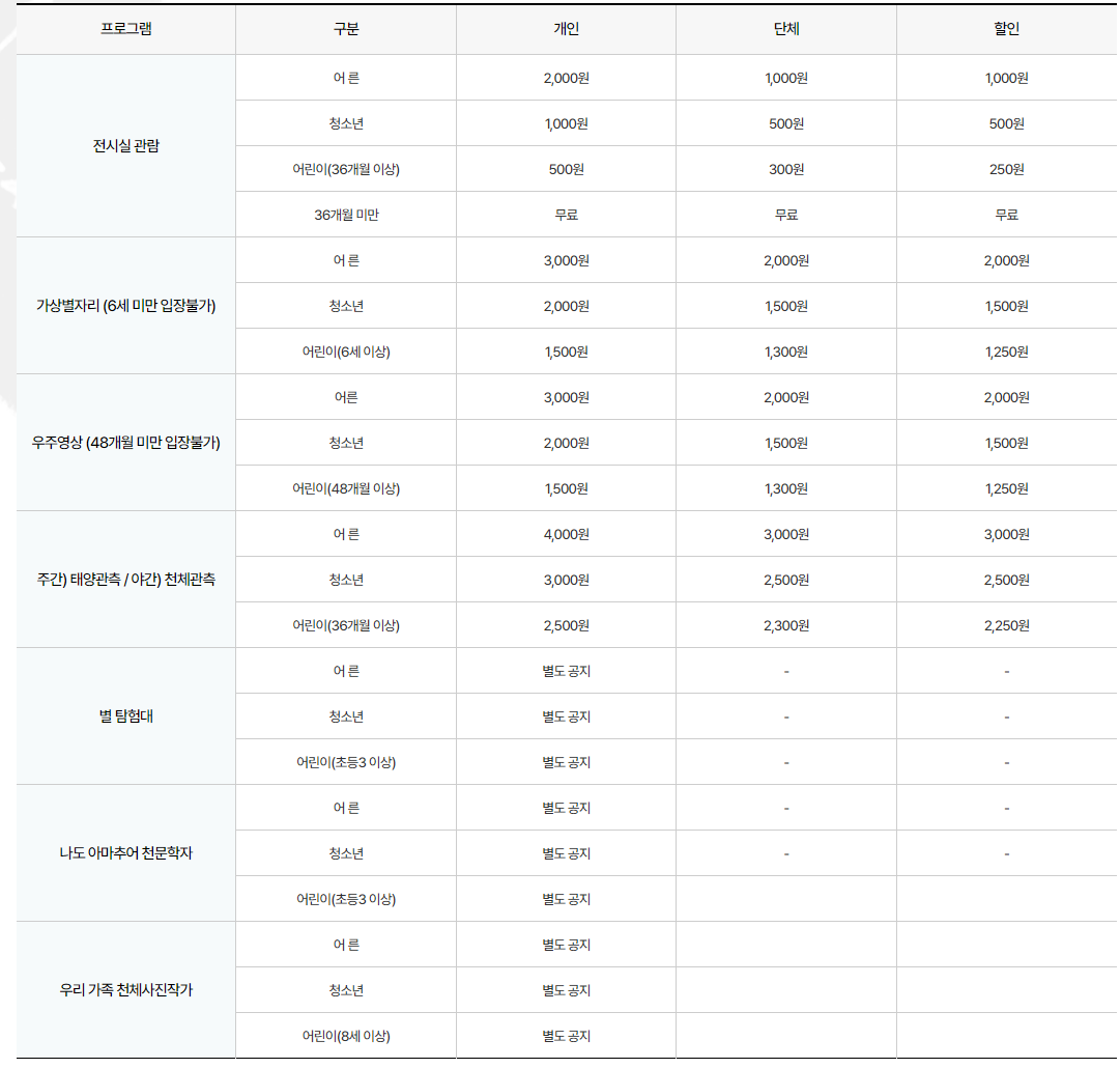 우주영상: 어른 3,000원, 청소년 2,000원, 어린이 1,500원 (48개월 이상 입장 가능)