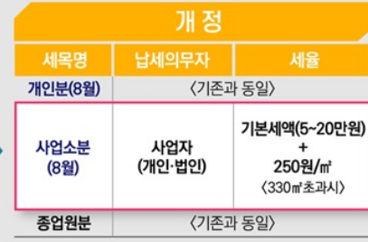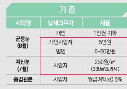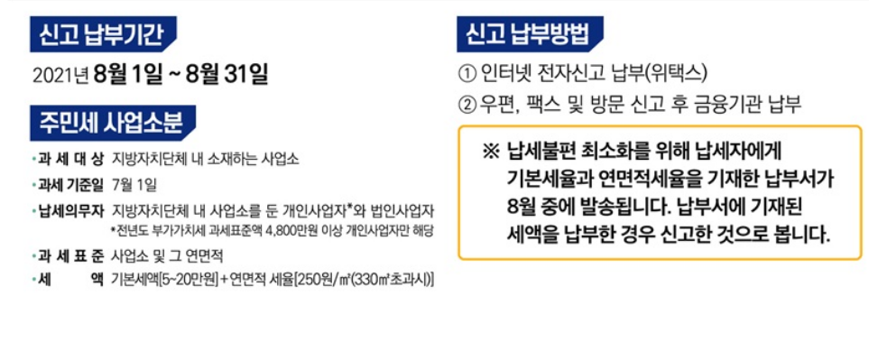 사업소분 8월 1일(금) ~ 8월 31일(일) 사업장 보유 사업자 개인·법인 자본금·면적·과세표준에 따라 50,000~200,000원