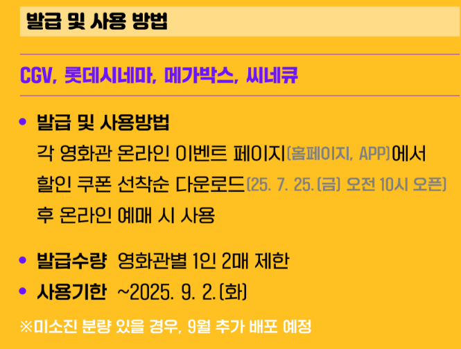 총 450만 장이 배포되며, CGV, 롯데시네마, 메가박스, 씨네Q 등 대형 멀티플렉스 뿐만 아니라 독립·예술영화관, 작은 영화관, 실버 영화관에서도 사용할 수 있어요.