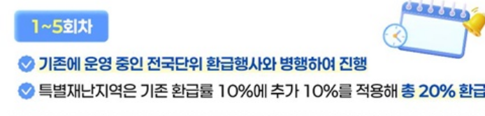 1~5회차: 기존 전국 단위 환급행사(10%)와 중복으로 적용됩니다. 특별재난지역에서는 추가로 10%를 더 주니까, 총 20% 환급!