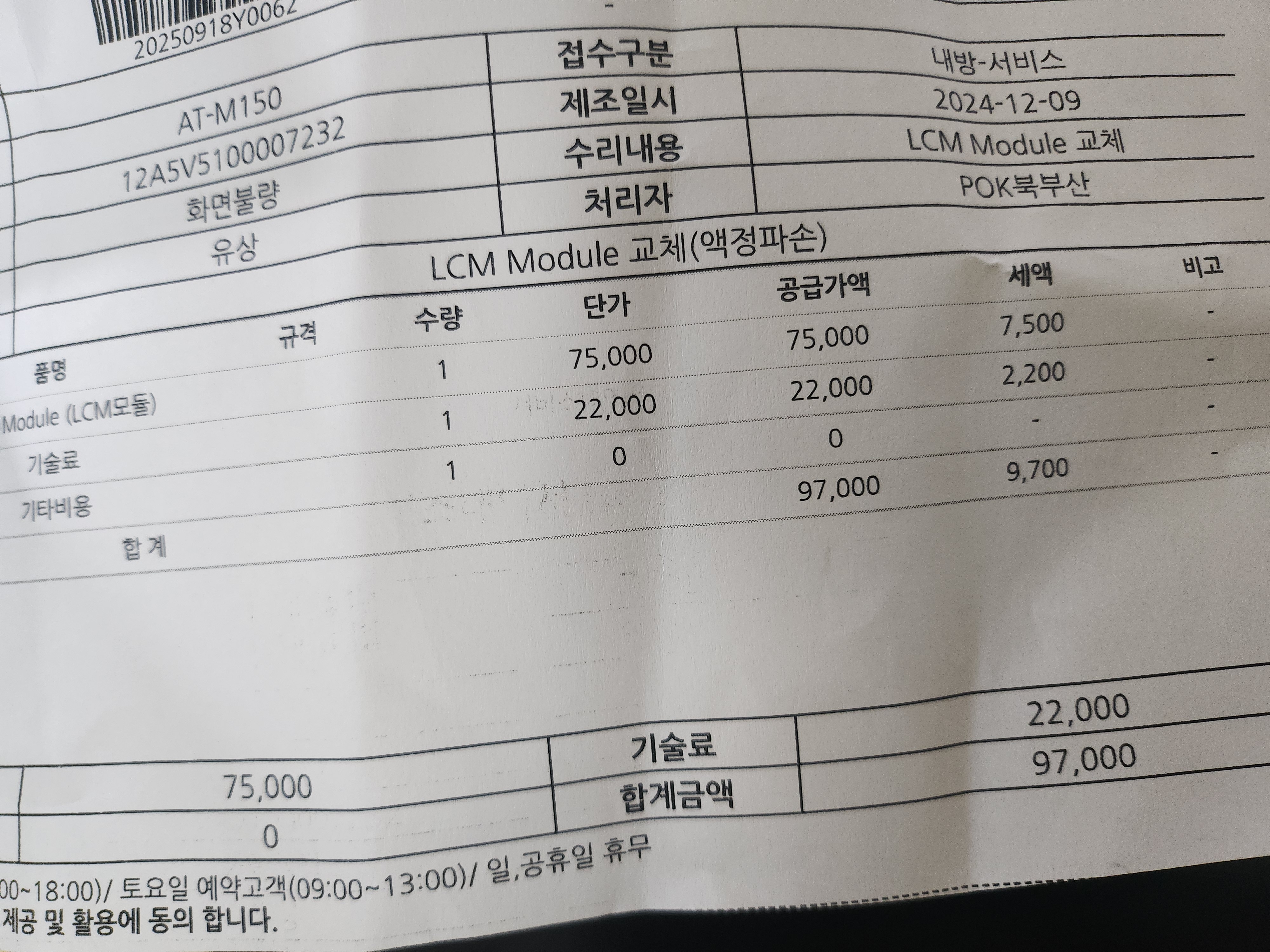 폰 모델명은 AT-M150S (ZEM폰)이었고, 한시간정도 기다려서 액정교체가 끝났습니다.