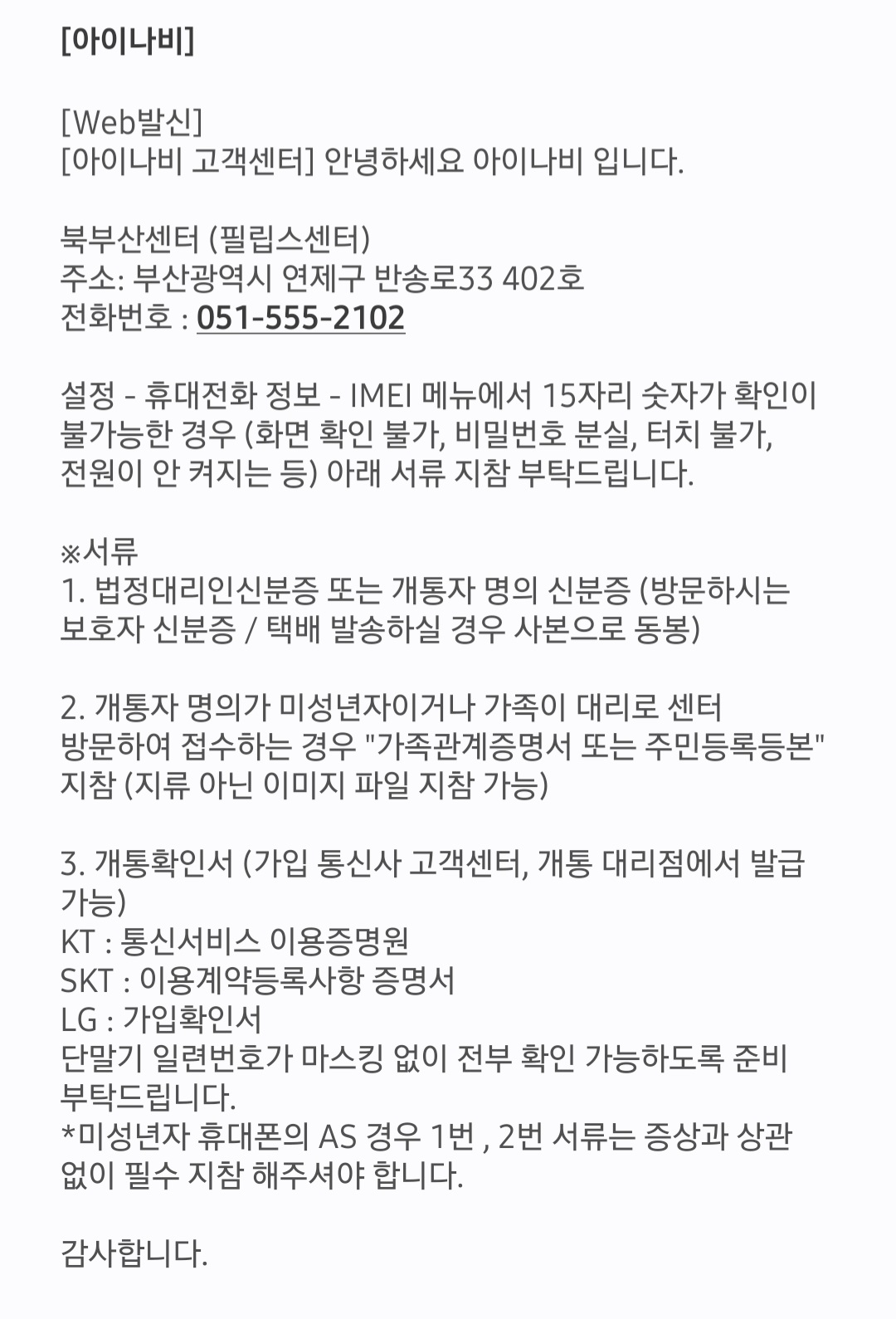 그 후 아이나비 고객센터로 전화를 걸었고, 가까운 서비스센터 주소와 절차를 안내받을 수 있었습니다.