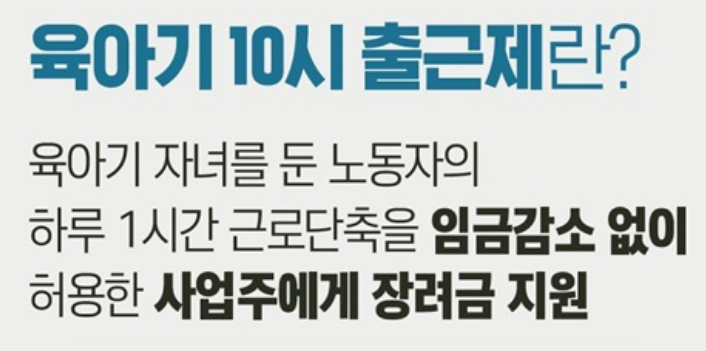 육아기 10시 출근제는 육아기 자녀를 둔 노동자의 근로시간을 하루 1시간 단축하면서도 임금은 줄이지 않는 제도다.
